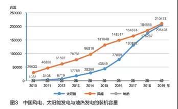 近10年,中國(guó)風(fēng)電、太陽(yáng)能發(fā)電裝機(jī)保持快速增長(zhǎng)態(tài)勢(shì)。2019年,非化石能源發(fā)電裝機(jī)占總裝機(jī)容量的41%,風(fēng)電和太陽(yáng)能發(fā)電裝機(jī)容量之和達(dá)40萬(wàn)兆瓦以上,地?zé)醿H49兆瓦(見(jiàn)圖3)。在太陽(yáng)能、風(fēng)電等已獲先發(fā)優(yōu)勢(shì)的條件下,發(fā)揮地?zé)岚l(fā)電的后發(fā)優(yōu)勢(shì),是增強(qiáng)風(fēng)電、太陽(yáng)能發(fā)電供應(yīng)穩(wěn)定性的有利選擇。