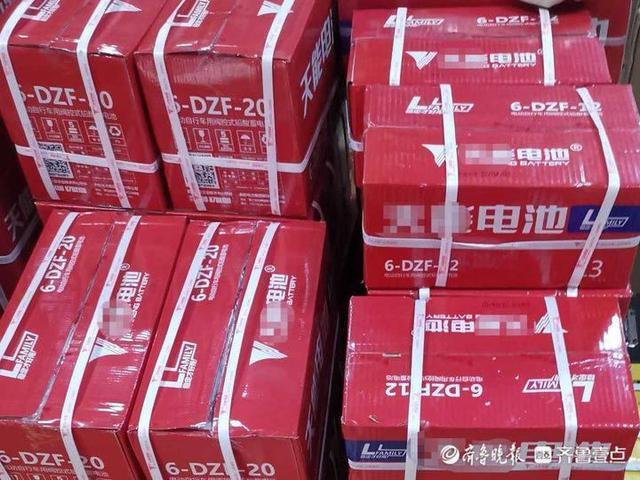 (濟(jì)南一家電動(dòng)車配件店里堆放的某品牌電池。)