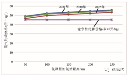 從氫能產(chǎn)業(yè)鏈中制氫、運氫、加注3個環(huán)節(jié)(含儲氫)的費用出發(fā),分析氫氣終端價格在一定運輸范圍內(nèi)的變化趨勢。