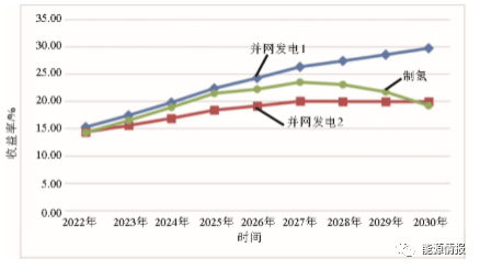 2020年風電制氫內(nèi)部收益率基本接近電力行業(yè)基準收益率;自2021年起風電制氫具備投資回收條件,2027年內(nèi)部收益率達到峰值,為市場主體進入風電等可再生能源制氫市場的最佳時間點;2027年以后,風電制氫投資收益呈下降趨勢,但總體收益率較“十四五”仍具有普遍競爭力。綜合考慮市場需求增長,預(yù)計2025—2030年間風電制氫將進入行業(yè)快速發(fā)展階段,逐漸成為氫能市場需求的重要補充。