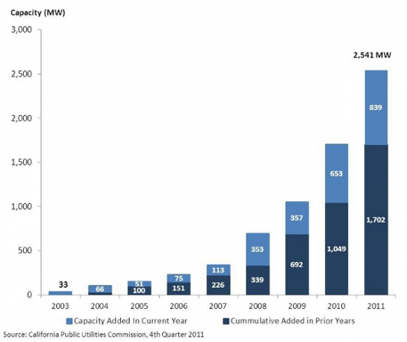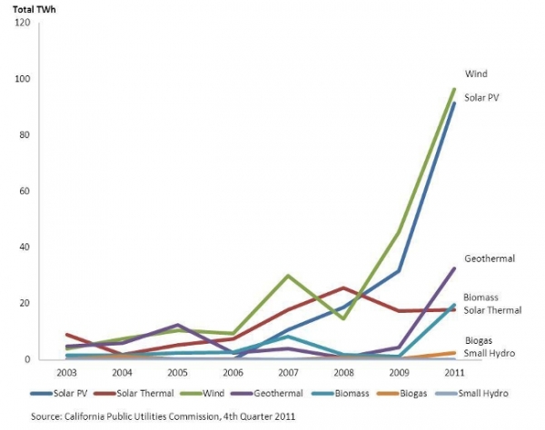 “在過去的兩年中價(jià)格較高,企業(yè)紛紛創(chuàng)新,成功降低了成本。鑒于成本下降過多,因此眾多商業(yè)模型都不再適用,因?yàn)閮r(jià)格已經(jīng)下降到他們無法再提供合適的解決方案的地步。我們看到新興安裝企業(yè)和其它小型公司漸漸萎縮,部分原因是受到資本市場的限制。某些公司現(xiàn)在正掙扎在投資競爭和擴(kuò)大規(guī)模之間,投資者減少投資是因?yàn)樗麄兺顿Y的回報(bào)達(dá)不到預(yù)期水平。價(jià)格下降如此之多要感謝中國企業(yè),您可以認(rèn)為這對(duì)行業(yè)有好處,但大量商業(yè)模型和新技術(shù)已經(jīng)不足以讓投資者冒險(xiǎn)投入大筆資金。便宜的中國進(jìn)口產(chǎn)品據(jù)稱也決定著加州投標(biāo)將產(chǎn)生價(jià)格戰(zhàn),從而導(dǎo)致2011年的懇請(qǐng),價(jià)格低到7美分,是實(shí)現(xiàn)2020年33%可再生能源目標(biāo)所需的競標(biāo)數(shù)四倍。加州公共事業(yè)委員會(huì)RPS的2011年第四季度報(bào)告稱,2011年830MW以上的可再生能源產(chǎn)量上線。但盡管CPUC受法律制約必須將RPS的競標(biāo)盡量向外界開放,但對(duì)于開發(fā)商建設(shè)項(xiàng)目的價(jià)格仍保持小心謹(jǐn)慎。根據(jù)平均交付時(shí)間加權(quán)調(diào)整的所有合同的成本從2003年的5.4美分到2011年的13.3美分。所有合同加權(quán)平均值約為11.9美分。最近,2011年RPS懇請(qǐng)中的競標(biāo)雖然并未包含在報(bào)告中,但卻顯示出巨額的成本下降,這將反映在未來投資者所有的公共設(shè)施項(xiàng)目合同中。”