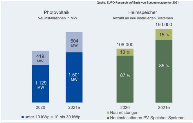 根據(jù)EUPD Research公司的分析,這一舉措正在推動(dòng)德國住宅太陽能發(fā)電領(lǐng)域的強(qiáng)勁增長(zhǎng)。在2021年第一季度,部署的裝機(jī)容量為10kW的住宅太陽能發(fā)電設(shè)施與去年同期相比增長(zhǎng)了39%,新增部署的此類住宅太陽能發(fā)電設(shè)施的裝機(jī)容量從154MW增長(zhǎng)到215MW。對(duì)于裝機(jī)容量為在10kW到30kW之間的住宅太陽能發(fā)電設(shè)施,同比增長(zhǎng)幅度更高,達(dá)到142%,新增此類住宅太陽能發(fā)電設(shè)施的裝機(jī)容量從27 MW增長(zhǎng)到66 MW。