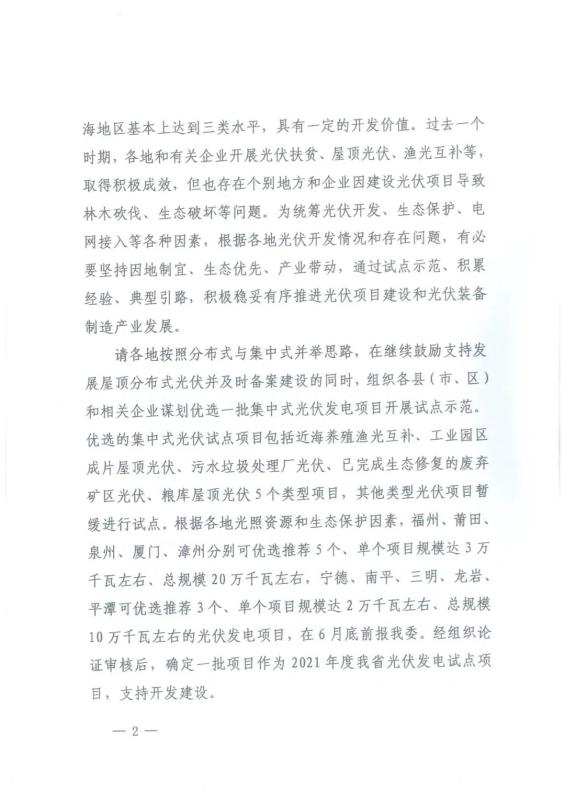 根據(jù)文件,福建省在東南沿海地區(qū)光照資源基本達(dá)到三類要求,具有一定開發(fā)價(jià)值,為避免因開發(fā)光伏項(xiàng)目導(dǎo)致生態(tài)破壞,故通過本文件優(yōu)先落地一批試點(diǎn)項(xiàng)目,從而規(guī)范引導(dǎo)并推進(jìn)光伏產(chǎn)業(yè)的發(fā)展。