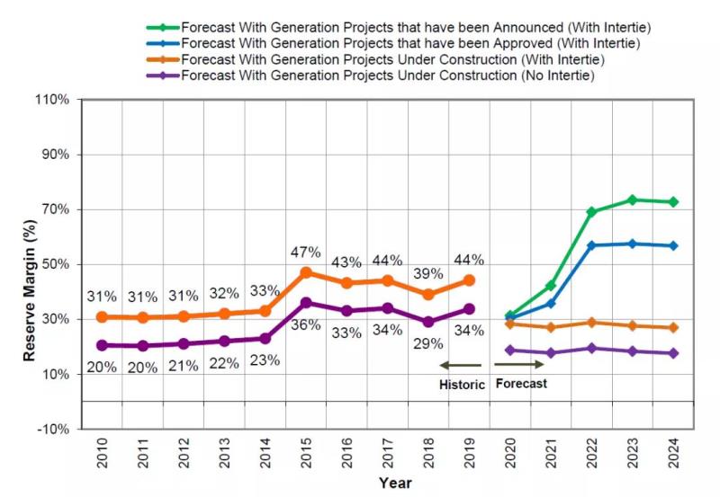 在北美,系統(tǒng)可靠性規(guī)劃以備用容量研究為中心。備用容量研究通常包括年度和年內(nèi)對三個問題的分析和公開報告:(1)現(xiàn)有備用容量的估計,(2)預(yù)測的備用容量,以及(3)在可靠性目標的基礎(chǔ)上,設(shè)置目標備用容量水平。對電力公司和其他發(fā)電所有者來說,通過這些研究進行可靠性規(guī)劃,為關(guān)?;蛱蕴l(fā)電機組打下了基礎(chǔ)。即使在美國、加拿大和其他電力市場發(fā)達的地區(qū),這種類型的可靠性規(guī)劃也非常重要。圖6顯示了阿爾伯塔省電力市場備用容量的定期預(yù)測。隨著可靠性問題和無意的偏見時而顯現(xiàn),北美備用容量規(guī)劃研究的具體細節(jié)和方法也在不斷演變。
