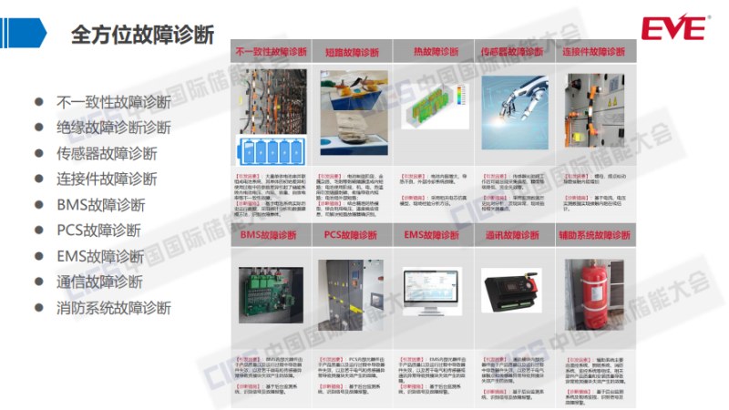 從整個(gè)系統(tǒng)的故障診斷來說,我們會(huì)把整個(gè)系統(tǒng)所有關(guān)鍵的點(diǎn)納入到整個(gè)監(jiān)控范圍內(nèi),像不一致性故障診斷、絕緣故障、傳感器故障、連接件的故障,我們之前碰到過連接件的故障,它主要是在正極、負(fù)極或者關(guān)鍵連接點(diǎn)出現(xiàn)過熱,這一塊我們都會(huì)布相關(guān)的采溫點(diǎn),能夠把風(fēng)險(xiǎn)點(diǎn)及時(shí)識(shí)別到,還有包括BMS故障,包括本身硬件及通訊故障等等,我們都會(huì)相應(yīng)故障診斷功能。