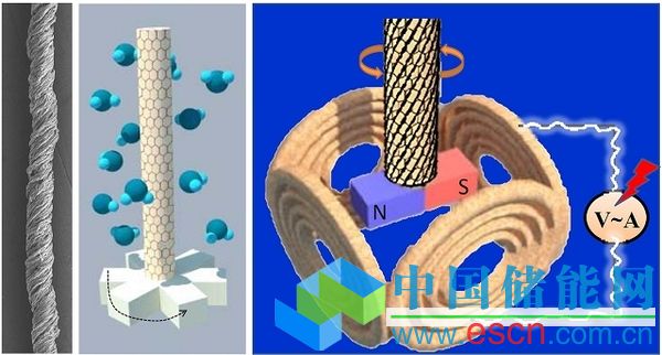 圖示:螺旋石墨烯纖維在濕度改變下帶動磁鐵旋轉(zhuǎn)產(chǎn)生電能