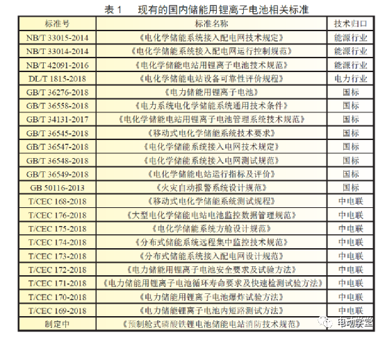 2014年對(duì)口IEC/TC120的全國電力儲(chǔ)能標(biāo)準(zhǔn)化技術(shù)委員會(huì)(SAC/TC550)成立,負(fù)責(zé)電力儲(chǔ)能領(lǐng)域標(biāo)準(zhǔn)化體系的建立及相關(guān)標(biāo)準(zhǔn)的制定工作。國內(nèi)鋰電儲(chǔ)能相關(guān)標(biāo)準(zhǔn)見表1。