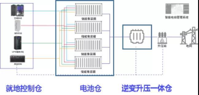 據(jù)采日能源介紹,集群大模塊化,即模塊數(shù)量級的增加,集群儲能系統(tǒng)包含電池倉、就地控制倉、智能箱變?nèi)齻€主模塊。電池倉包含電池模組、電池簇、空調(diào)內(nèi)機、消防內(nèi)機(不含消防氣體)、直流匯流柜等,多個集裝箱共用一個就地控制倉,就地控制倉包含就地控制器、中央空調(diào)主機、消防主機和、智能箱變包含PCS和升壓變。