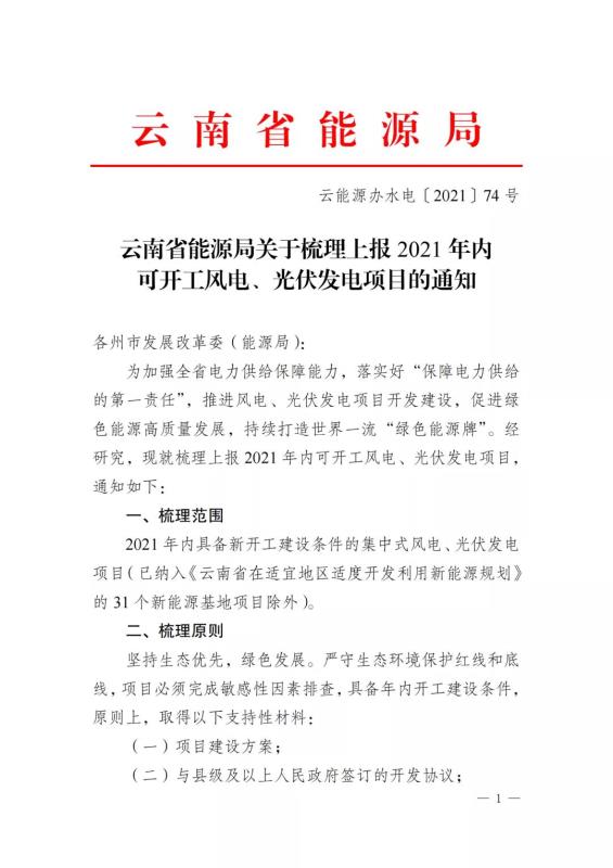 6月3日,云南省能源局發(fā)布《關(guān)于梳理上報 2021年內(nèi)可開工風電、光伏發(fā)電項目的通知》,對2021年內(nèi)具備新開工建設(shè)條件的集中式風電、光伏發(fā)電項目(已納入《云南省在適宜地區(qū)適度開發(fā)利用新能源規(guī)劃》的 31個新能源基地項目除外)進行了梳理。據(jù)了解,這是云南省自“8+3”項目以后的第二批項目,項目的啟動將為云南省“十四五”期間新能源發(fā)展打下的良好基礎(chǔ)。
