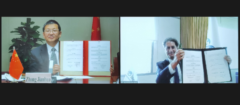 6月7日,中國國家能源局局長章建華在北京以視頻形式會見國際可再生能源署(IRENA)總干事弗朗西斯科·卡梅拉,雙方共同簽署《中國國家能源局與國際可再生能源署諒解備忘錄》。