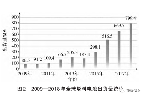 燃料電池通過電化學(xué)反應(yīng)將氫氣的化學(xué)能直接轉(zhuǎn)化為電能,清潔無污染,能量轉(zhuǎn)化效率高,是氫能源的最佳利用方式,在全球范圍內(nèi)具有廣闊的應(yīng)用前景。2009—2018 年全球燃料電池出貨量統(tǒng)計如圖 2 所示,由圖可見出貨量統(tǒng)計數(shù)據(jù)增勢明顯。燃料電池類型主要包括堿性電解質(zhì)、質(zhì)子交換膜、磷酸、熔融碳酸鹽和固體氧化物燃料電池,區(qū)別在于電解質(zhì)和工作環(huán)境溫度不同,適合的應(yīng)用場景也有差異。