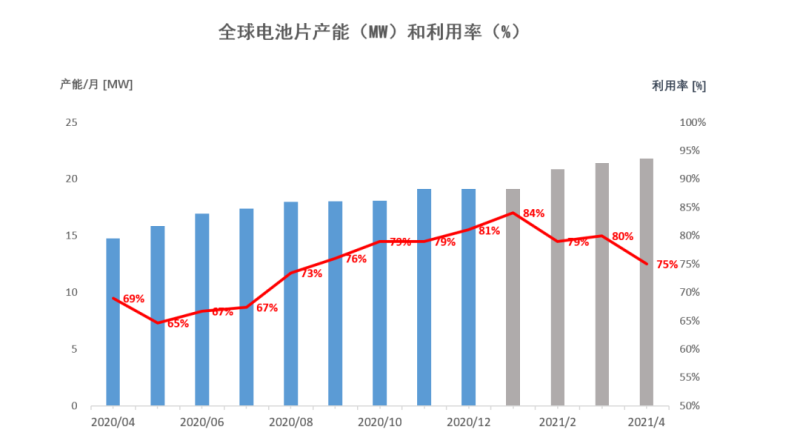 4月全球電池片產(chǎn)能下降明顯至75%(數(shù)據(jù)來源:賀利氏)