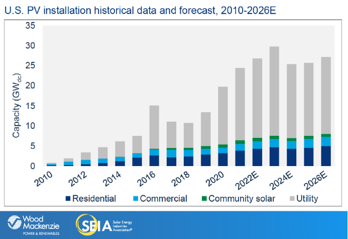 根據(jù)伍德麥肯茲的預(yù)測(cè),光伏投資稅收抵免(ITC)將繼續(xù)具有高度影響力,并將在未來(lái)三年推動(dòng)創(chuàng)紀(jì)錄的增長(zhǎng)和投資。預(yù)計(jì)從2021年到2026年,太陽(yáng)能裝機(jī)容量將達(dá)到160GW,到2026年底,光伏總裝機(jī)容量將超過(guò)250 GW。