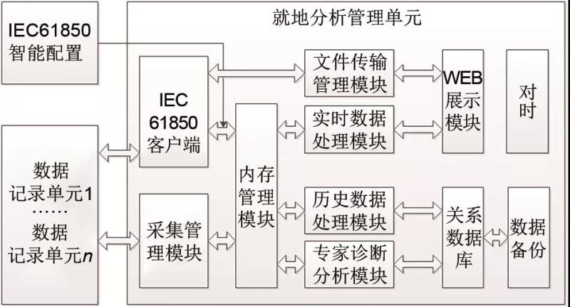 人機(jī)交互采用WEB方式展示波形和運(yùn)行信息;數(shù)據(jù)庫(kù)保存儲(chǔ)能艙長(zhǎng)期運(yùn)行數(shù)據(jù),為專(zhuān)家診斷分析模塊提供數(shù)據(jù)支撐;采集管理模塊作為數(shù)據(jù)記錄單元信息接入接口。就地分析管理單元的框圖如圖7所示。