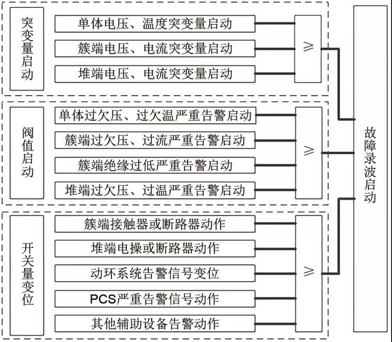 本系統(tǒng)覆蓋儲(chǔ)能艙內(nèi)各類(lèi)故障及異常情況,啟動(dòng)判據(jù)主要考慮以下幾種情況:?jiǎn)误w電池電壓/溫度異常、電池簇端電壓/電流異常、電池堆端電壓/電流異常、儲(chǔ)能系統(tǒng)絕緣異常、消防動(dòng)環(huán)告警、PCS告警、儲(chǔ)能艙內(nèi)各開(kāi)關(guān)動(dòng)作、充放電啟動(dòng)等。本系統(tǒng)支持三種方式的故障錄波啟動(dòng)判斷:突變量啟動(dòng)、閥值啟動(dòng)、開(kāi)關(guān)量變化啟動(dòng),故障錄波啟動(dòng)判斷邏輯見(jiàn)圖4。