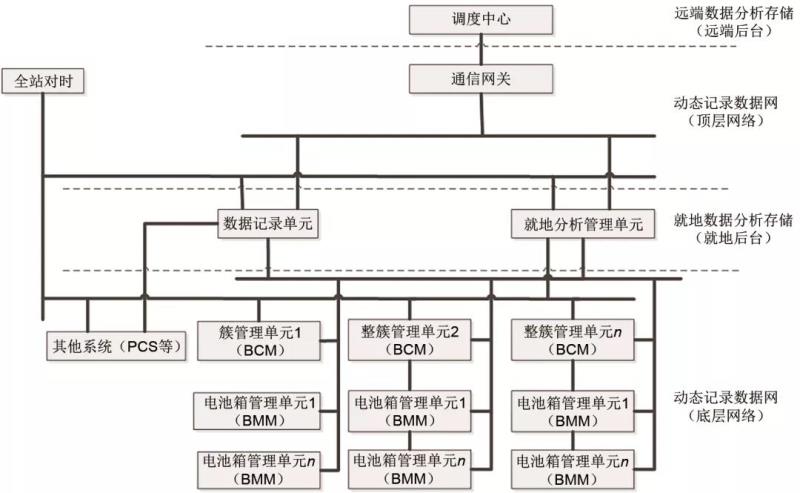 每個(gè)電池箱內(nèi)安裝電池箱管理單元(BMM),完成對(duì)箱體內(nèi)單體電池電壓和溫度的采集工作。若干個(gè)電池箱構(gòu)成一個(gè)電池簇,簇內(nèi)建立一個(gè)數(shù)據(jù)傳輸網(wǎng)絡(luò),簇內(nèi)信息由簇管理單元(BCM)管理,匯總簇單體電壓、溫度等信息,BCM同時(shí)完成簇端電壓、電流、絕緣的采集工作,形成對(duì)整簇電池的保護(hù)控制策略。多個(gè)電池簇并聯(lián)構(gòu)成一個(gè)電池堆,簇與簇之間采用另一個(gè)網(wǎng)絡(luò)進(jìn)行簇間信息傳輸。數(shù)據(jù)記錄單元接入到這兩個(gè)網(wǎng)絡(luò)中,并從中獲取所需數(shù)據(jù)。數(shù)據(jù)記錄單元通過(guò)接收PCS端的信息,用于獲取PCS的運(yùn)行狀態(tài)。數(shù)據(jù)記錄單元的數(shù)據(jù)與就地分析管理單元和調(diào)度中心通過(guò)網(wǎng)絡(luò)進(jìn)行數(shù)據(jù)通信,全站對(duì)時(shí)系統(tǒng)對(duì)站內(nèi)設(shè)備進(jìn)行時(shí)間同步。