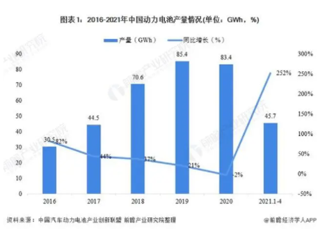 從產(chǎn)量看,據(jù)中國(guó)汽車動(dòng)力電池產(chǎn)業(yè)創(chuàng)新聯(lián)盟統(tǒng)計(jì)數(shù)據(jù),2016-2019年,我國(guó)動(dòng)力電池產(chǎn)量持續(xù)增長(zhǎng),2020年我國(guó)動(dòng)力電池產(chǎn)量較2019年減少2%。2021年1-4月,我國(guó)動(dòng)力電池產(chǎn)量恢復(fù)增長(zhǎng),累計(jì)產(chǎn)量為45.7GWh,同比增長(zhǎng)252%。