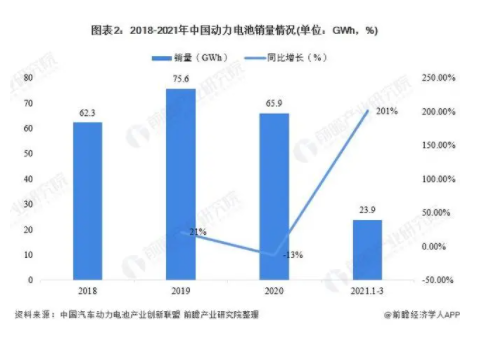 2020年,我國(guó)動(dòng)力電池銷量也有所下降,較2019年減少13%。2021年1-3月,我國(guó)動(dòng)力電池銷量恢復(fù)增長(zhǎng),銷量累計(jì)達(dá)23.9GWh,同比增長(zhǎng)201%。