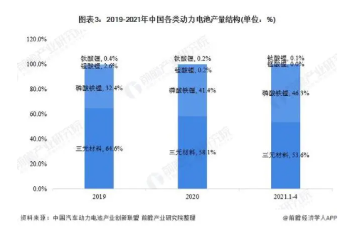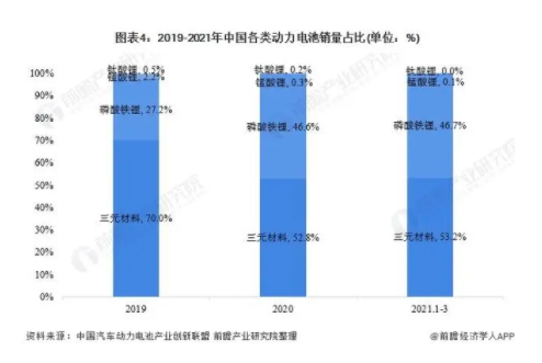 從銷量占比來看,2019-2021年3月,我國(guó)磷酸鐵鋰電池的銷量占比在逐步擴(kuò)大,從27.2%增至46.7%。