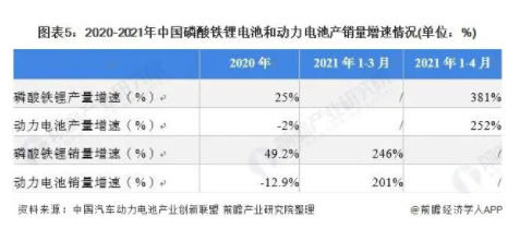 從產(chǎn)銷量增速來看,磷酸鐵鋰電池產(chǎn)銷量增速高于行業(yè)整體增速水平。2020年,全國(guó)動(dòng)力電池產(chǎn)銷量均有所下降,但磷酸鐵鋰電池產(chǎn)銷量卻有所增長(zhǎng);2021年1-4月,磷酸鐵鋰電池產(chǎn)量達(dá)21.2GWh,同比累計(jì)增長(zhǎng)381%;2021年1-3月,我國(guó)磷酸鐵鋰電池累計(jì)銷售11.1GWh,同比累計(jì)增長(zhǎng)246%。