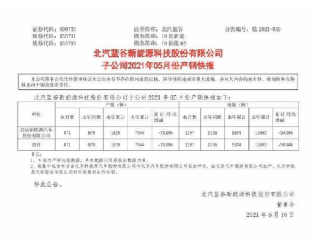 今年前5個月,北汽新能源累計銷售5374輛,相比去年同期1.17萬,同比下滑了54.04%。
