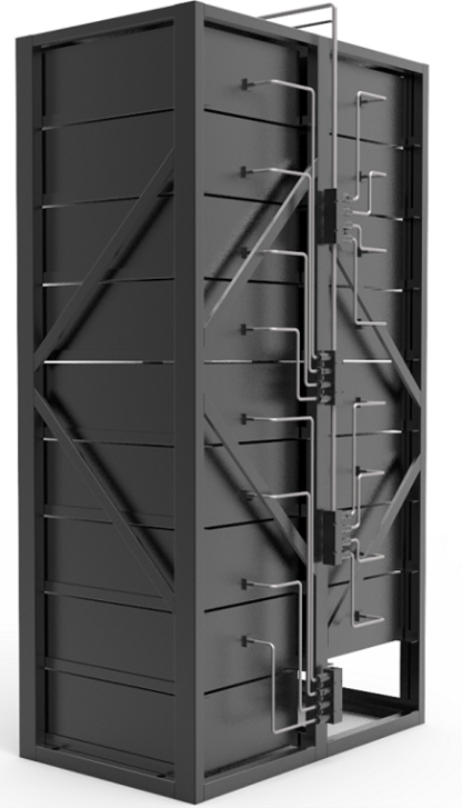 電池模塊在方艙內(nèi)部走廊側(cè)為百葉窗結(jié)構(gòu),通過軟管連接至風(fēng)冷管道。當(dāng)風(fēng)冷循環(huán)啟動(dòng)后,管道側(cè)為高靜壓風(fēng)機(jī)提供的負(fù)壓,即電芯正常工作時(shí)產(chǎn)生的熱量通過空氣強(qiáng)對(duì)流被吸入風(fēng)冷管道,熱空氣在封閉式的管道內(nèi)部經(jīng)由空調(diào)或者全熱熱交換器轉(zhuǎn)換為冷風(fēng),再通過高靜壓風(fēng)機(jī)的冷風(fēng)出口送至方艙內(nèi)部走廊,隨后再次被吸入電池模塊,從而實(shí)現(xiàn)艙內(nèi)空氣管道內(nèi)循環(huán)。