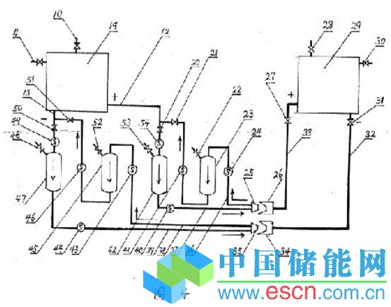上述連接系統(tǒng)通過微電腦的程序化控制,可先將被換液電池體(29)里放電后的正、負無電電液通過b泵體(24)和f泵體(43)抽出暫存在a儲液罐(23)和c儲液罐(45)中,此時在被換液電池體正極電液管(33)上的電池閥(27)和負極電液管(32)上的電池閥(31)是打開的,還有電池體上的出氣閥(28)和(30)也是打開的;然后再將b儲液罐(42)和d儲液罐(47)中充好電的有電電液通過d泵體(40)h和泵體(44)加注到被換液電池體中,最后再將暫存在a儲液罐(23)和c儲液罐(45)中的正、負無電電液通過a泵體(21)和e泵體(51)分別回送到充電電池體(19)中進行再一次的充電過程(該裝置讓充電的時間得到重新分配,使客戶的長時充電時間轉(zhuǎn)移給了專業(yè)的充電站完成,從而解決了電動汽車充電速度慢的技術(shù)瓶頸)。該電池漿液可循環(huán)使用,節(jié)約資源,綠色環(huán)保,如同加油,方便快捷,開啟了汽車的“電油”時代!