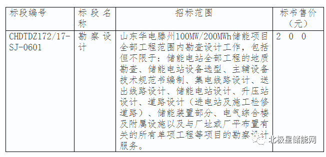 山東華電滕州100MW/200MWh儲能項目全部工程范圍內(nèi)勘查設(shè)計工作,包括但不限于:儲能電站全部工程的地質(zhì)勘查、儲能電站設(shè)備選型、主輔設(shè)備技術(shù)規(guī)范書編制、集電線路設(shè)計、送出線路設(shè)計、儲能電站設(shè)計、升壓站設(shè)計、道路設(shè)計(進電站及施工檢修道路)、儲能裝置部分、電氣綜合樓及附屬設(shè)施以及與廠址或廠平布置有關(guān)的所有單項工程等項目的勘察設(shè)計服務(wù)。