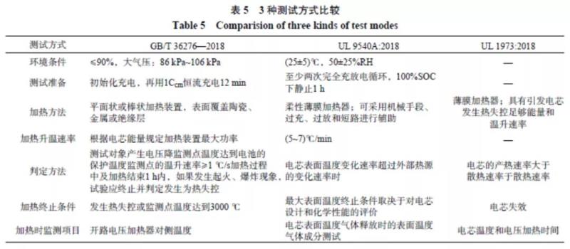 所以,儲能電池需要進行電池熱失控測試,目前,儲能用電池熱失控要求和測試方法的相關(guān)標準有GB/T 36276—2018,UL9540A:2018,UL1973:2018,各標準應用場景大體相同,但測試存在差異性,如表5所示。