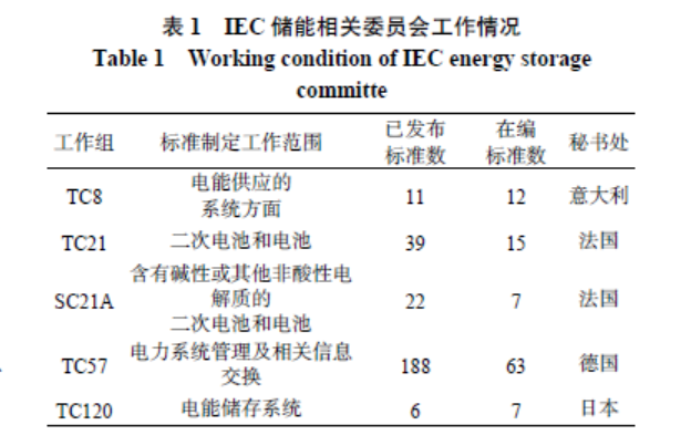 在制定標準這方面,國際電工委員會IEC涉及儲能標準制定工作的工作組有TC8、TC21、SC21A、T120等,具體標準工作內(nèi)容情況如表1所示。電子電氣工程師協(xié)會IEEE自2003年起陸續(xù)發(fā)布了一系列儲能電站相關(guān)標準,其中IEEE1547在全球得到實際應用與廣泛執(zhí)行,是推動儲能在智能電網(wǎng)應用的關(guān)鍵基石標準。美國保險商試驗所(Underwriter Laboratories Inc,UL)、NFPA、德國電氣工程師協(xié)會標會(Verband Deutscher Elektrotechniker,VDE)、日本電氣規(guī)格協(xié)會(Japanese Standards Association,JEA)、南德意志集團(Technischer überwachungs-Verein,TUV)、歐盟CEN-CENELEC聯(lián)合工作組(Comité Européen de Normalisation,CEN)等標準制訂組織也陸續(xù)發(fā)布了關(guān)于電化學儲能的系列標準。