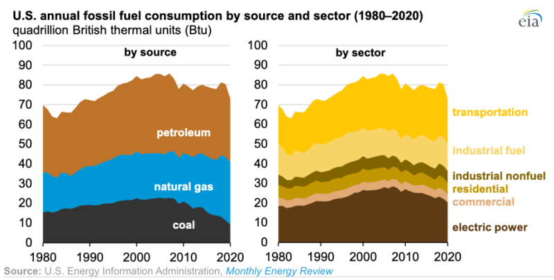 根據(jù)美國(guó)能源信息署的數(shù)據(jù), 2020年美國(guó)化石燃料(包括石油、天然氣和煤炭)的總消耗量降至72900萬億英熱單位(Btu),比2019年下降9%,為1991年以來的最低水平。