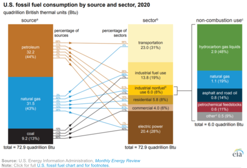 這是自1949年以來美國(guó)化石燃料消耗量以絕對(duì)值和百分比計(jì)算的最大年度下降,主要是受到2020年COVID-19疫情的影響,美國(guó)運(yùn)輸業(yè)能源消耗減少了15%。美國(guó)2020年冬天整體相對(duì)溫和,減少了對(duì)取暖燃料的需求。
