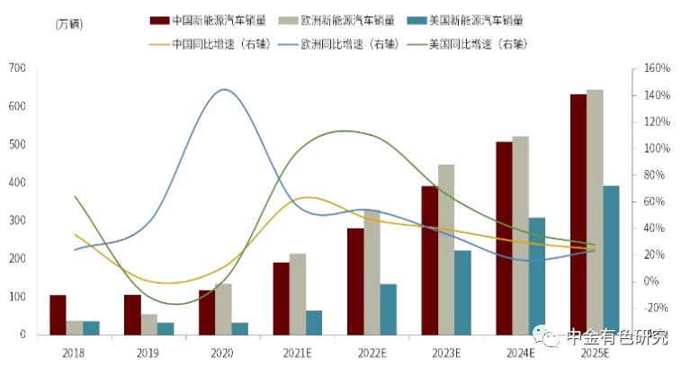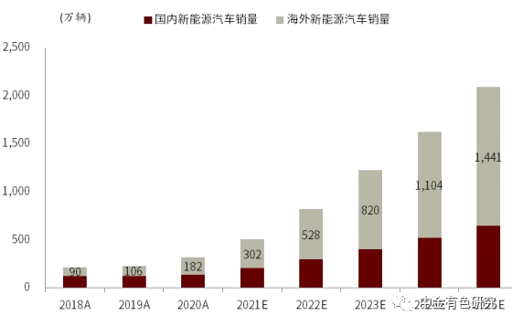 圖表3:全球新能源乘用車銷量與預(yù)測(EV+PHEV)