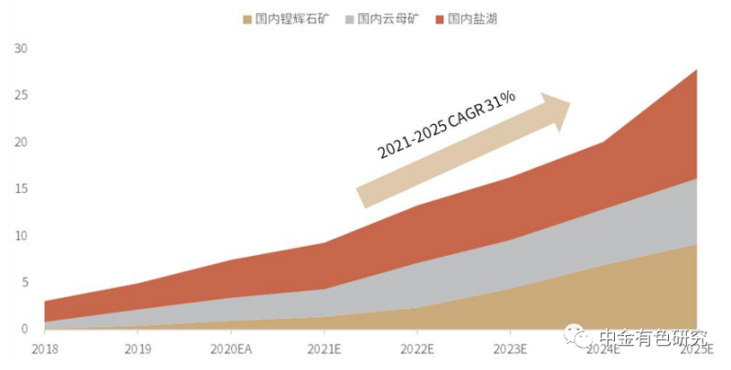 國內(nèi)鋰資源開發(fā)有望加速。國內(nèi)鋰資源雖儲量豐厚,但其資源稟賦并不出色,且受當(dāng)?shù)囟喾N因素制約,長期以來開發(fā)程度較低,僅作為供給側(cè)補充。在上輪鋰價下行期,國內(nèi)鋰礦及鹽湖產(chǎn)能逆周期擴張,且生產(chǎn)工藝持續(xù)進(jìn)化,當(dāng)前國內(nèi)鋰資源保障已經(jīng)提升到戰(zhàn)略高度,國內(nèi)優(yōu)質(zhì)鋰礦以及鹽湖資源的開發(fā)進(jìn)程有望加速,我們預(yù)計國內(nèi)鋰資源供給將從2021年的10.0萬噸LCE增長至2025年的29.8萬噸LCE,2021-2025年CAGR為31%。