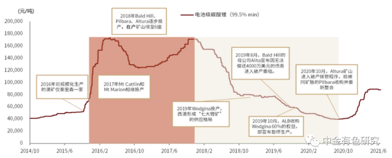 經(jīng)歷上輪鋰價下行周期,澳洲在產(chǎn)澳礦僅余四家。2016年前在產(chǎn)澳礦僅泰利森一家,2017年開始隨著新礦山的相繼投產(chǎn),澳洲逐步形成七大鋰礦格局。2018-2020年鋰精礦價格從高位經(jīng)歷了長達(dá)兩年的單邊下行,至2020年下半年鋰精礦價格下探到390美元/噸的歷史低點,低于除泰里森外主要在產(chǎn)澳礦的現(xiàn)金成本,澳礦企業(yè)隨之逐步出清,Wodgnia被收購后即雪藏,Bald Hill與Alura相繼破產(chǎn),至目前僅余四家在產(chǎn)澳礦。