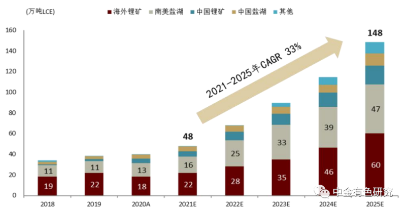 圖表1:2021-2025年各領(lǐng)域鋰需求CAGR