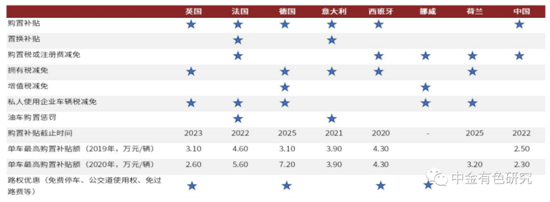 歐洲各國以高補貼政策刺激新能源汽車消費。歐洲各國對新能源汽車實施稅收減免等補貼以刺激新能源汽車消費,具體在購置補貼、登記稅、所有稅和公司用車稅上均有減免政策。在歐盟碳排放標(biāo)準(zhǔn)日益趨嚴(yán)的壓力下,各國或因難以達(dá)到補貼標(biāo)準(zhǔn)而延遲補貼退出,甚至進(jìn)一步增加補貼力度。以德國為例,2020年10月德國新車排放量為131.4g/km,距離歐盟95g/km的標(biāo)準(zhǔn)有一定差距,因此政府將撥款10億元,并將購買新能源汽車的消費者的補貼延長到2025年。