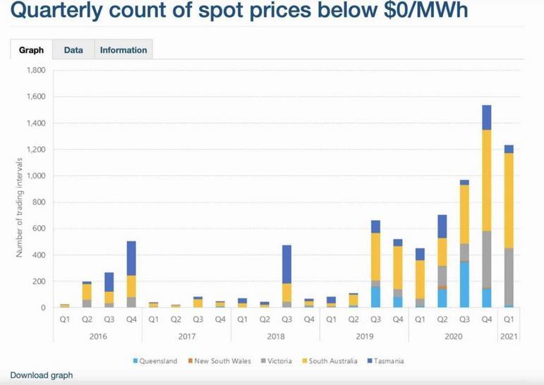 關(guān)鍵指標之一是負定價事件的數(shù)量。這種情況過去只發(fā)生在燃煤發(fā)電商競爭激烈的時候。而這種情況現(xiàn)在成倍增加,尤其是在白天,并且由于太陽能發(fā)電或風(fēng)力發(fā)電量有時過多,或者電網(wǎng)限制了與其他州共享電力輸出的機會。