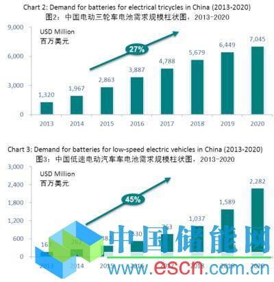 圖2:中國(guó)電動(dòng)三輪車電池需求規(guī)模柱狀圖,2013-2020;圖3:中國(guó)低速電動(dòng)汽車車電池需求規(guī)模柱狀圖,2013-2020