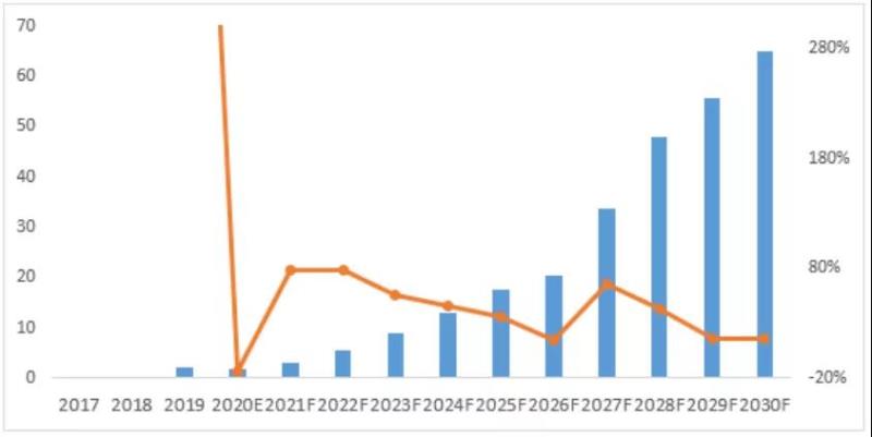2017~2030年中國(guó)重卡鋰電池出貨量及預(yù)測(cè)(GWh,%)