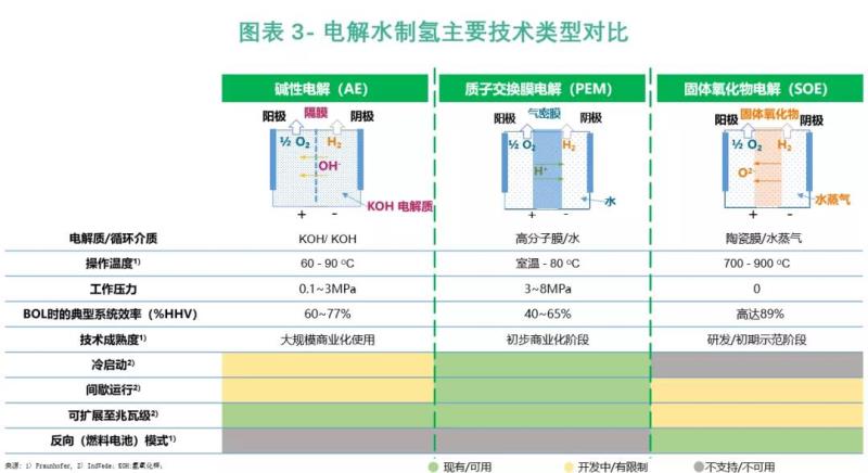 電解水制氫技術(shù)主要分為堿性水電解槽(ALK)、質(zhì)子交換膜水電解槽(PEM)和固體氧化物水電解槽(SOE)三類。三種技術(shù)的原理及技術(shù)特點(diǎn)見圖表3。