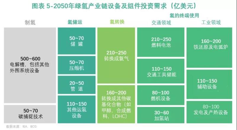 降本是電解水制氫的最大挑戰(zhàn),同時(shí)也創(chuàng)造了巨大的投資空間。根據(jù)BCG的預(yù)測,到2050年,全球綠氫產(chǎn)業(yè)鏈中每個(gè)環(huán)節(jié)所需的設(shè)備和組件投資總需求將達(dá)到2000億美元/年,其中電解水制氫及外圍輔助系統(tǒng)的設(shè)備及組件投資需求最高,達(dá)到500~600億美元/年,占總投資需求的1/4。