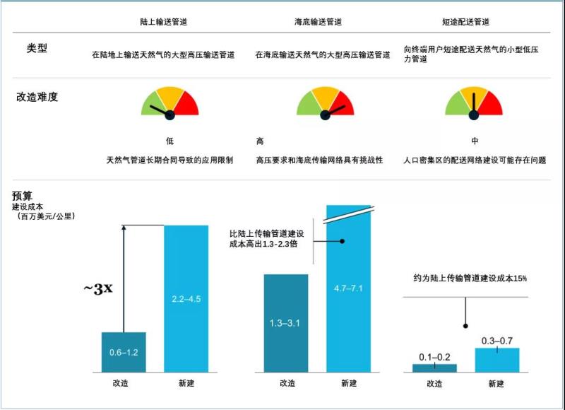 根據(jù)目前的項(xiàng)目來看,陸上氫氣管道的改造成本約為60-120萬美元/公里,新建管道成本約為220-450萬美元/公里;對于海上/海底氫氣管道,根據(jù)新建或改造的具體條件和建設(shè)難度,成本要比陸上管道高出1.3到2.3倍;而短途配送管道由于其較小的管徑和較低的壓力要求,建設(shè)和改造成本比傳輸管道便宜得多(大約只占傳輸管道成本的15%),但只有未來住宅和商業(yè)建筑對氫氣的需求超過天然氣摻氫臨界值(20%)的情況下,短途配送管道的大規(guī)模建設(shè)才具有經(jīng)濟(jì)性。(見圖5)