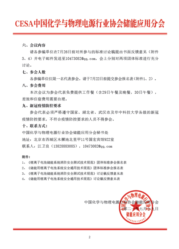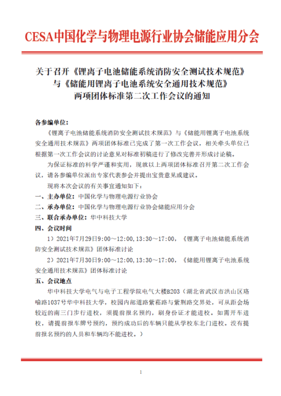 1)2021年7月29日9:00~12:00,13:30~17:00,《鋰離子電池儲(chǔ)能系統(tǒng)消防安全測(cè)試技術(shù)規(guī)范》團(tuán)體標(biāo)準(zhǔn)討論。
