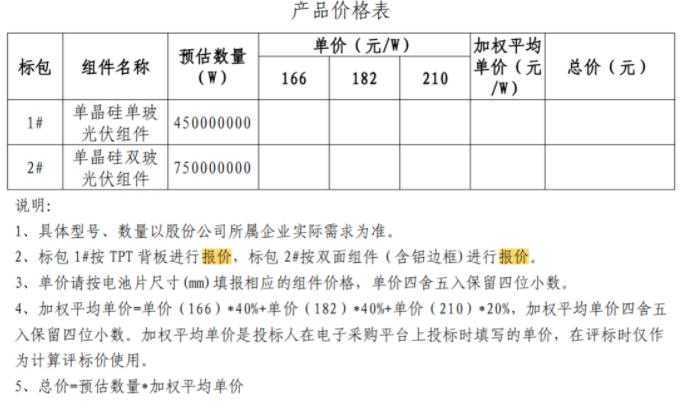 根據(jù)組件招標(biāo)文件,此次招標(biāo)劃分為兩個(gè)標(biāo)段:(001)單晶硅單玻光伏組件,450MW;(002)單晶硅雙玻光伏組件,750MW。此次招標(biāo)將確定中國(guó)能建2021-2022年光伏組件中標(biāo)供應(yīng)商,中標(biāo)人與股份公司簽訂框架協(xié)議,框架協(xié)議有效期一年。