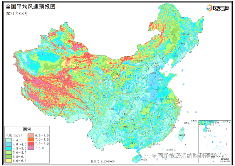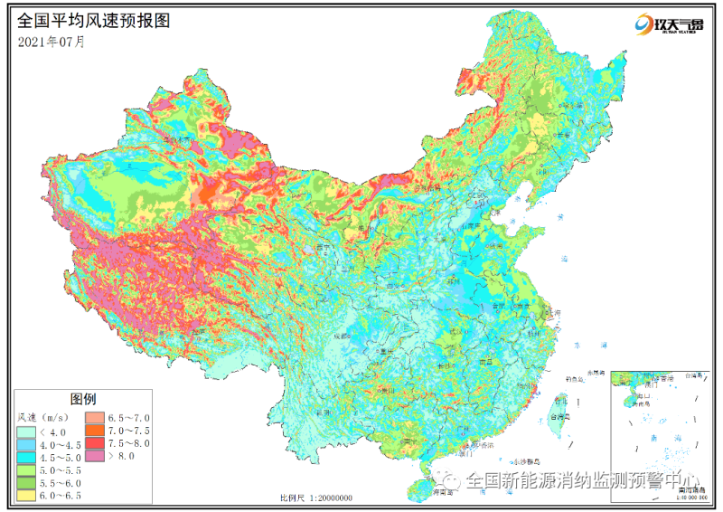 附圖1 全國(guó)2021年7月平均風(fēng)速分布預(yù)報(bào)圖