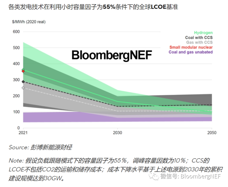 如今,太陽能和風能已經(jīng)成為電網(wǎng)脫碳的支柱。彭博新能源財經(jīng)的分析顯示,在電池的配合下,此類清潔能源發(fā)電容量有潛力幫助實現(xiàn)總發(fā)電量的70-80%脫碳。然而,對于有志于實現(xiàn)接近凈零排放的國家來說,這還不夠。因此,各類使用低碳技術(shù)的可調(diào)度電源開始登上舞臺,以滿足清潔能源不足時的用電需求。本文從成本競爭力的角度對該領(lǐng)域中的三位“種子選手”進行了對比:氫能(hydrogen)、碳捕獲和封存(CCS)以及小型模塊化核反應堆(SMR)技術(shù)。
