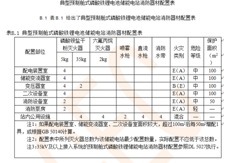 1、預(yù)制艙式磷酸鐵鋰電池儲(chǔ)能電站配置消防器材類(lèi)型、數(shù)量及區(qū)域的要求見(jiàn)下表:
