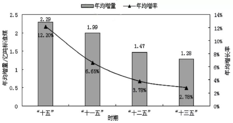 21世紀(jì)以來(lái),中國(guó)經(jīng)濟(jì)快速增長(zhǎng),工業(yè)化和城鎮(zhèn)化進(jìn)程加速,能源消費(fèi)大幅度增加。能源消費(fèi)總量從2000年的14.7億噸標(biāo)準(zhǔn)煤增加到2020年的49.8億噸標(biāo)準(zhǔn)煤,二十年間年均增長(zhǎng)6.3%。分時(shí)期看,五年規(guī)劃期間年均能源消費(fèi)增長(zhǎng)呈增量和增速逐期“雙下降”趨勢(shì)。從“十五”到“十三五”,四個(gè)五年規(guī)劃期年均能源消費(fèi)增量分別為2.29、1.99、1.47和1.28億噸標(biāo)準(zhǔn)煤,增速分別為12.20%、6.65%、3.78%和2.78%。