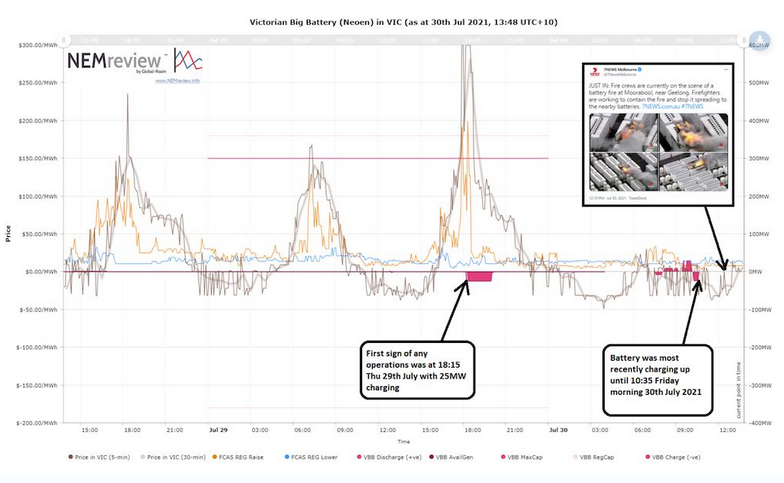 這張來自Watt Clarity的圖片表明,Victoria Big Battery電池儲(chǔ)能系統(tǒng)在火災(zāi)發(fā)生之前的前幾天進(jìn)行了一些測試。